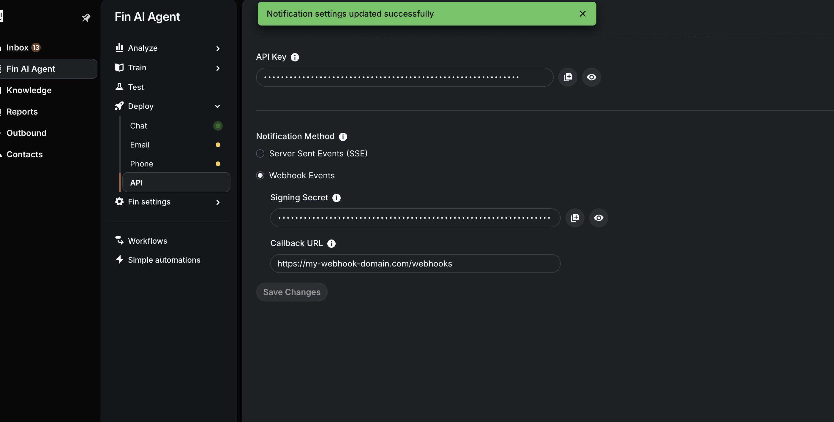 All webhook requests will include an X-Fin-Agent-API-Webhook-Signature header containing an HMAC-SHA256 signature of the request body. Validation can be done by generating a signature using the request body and the signing secret from the settings, and comparing it with the aforementioned header value.