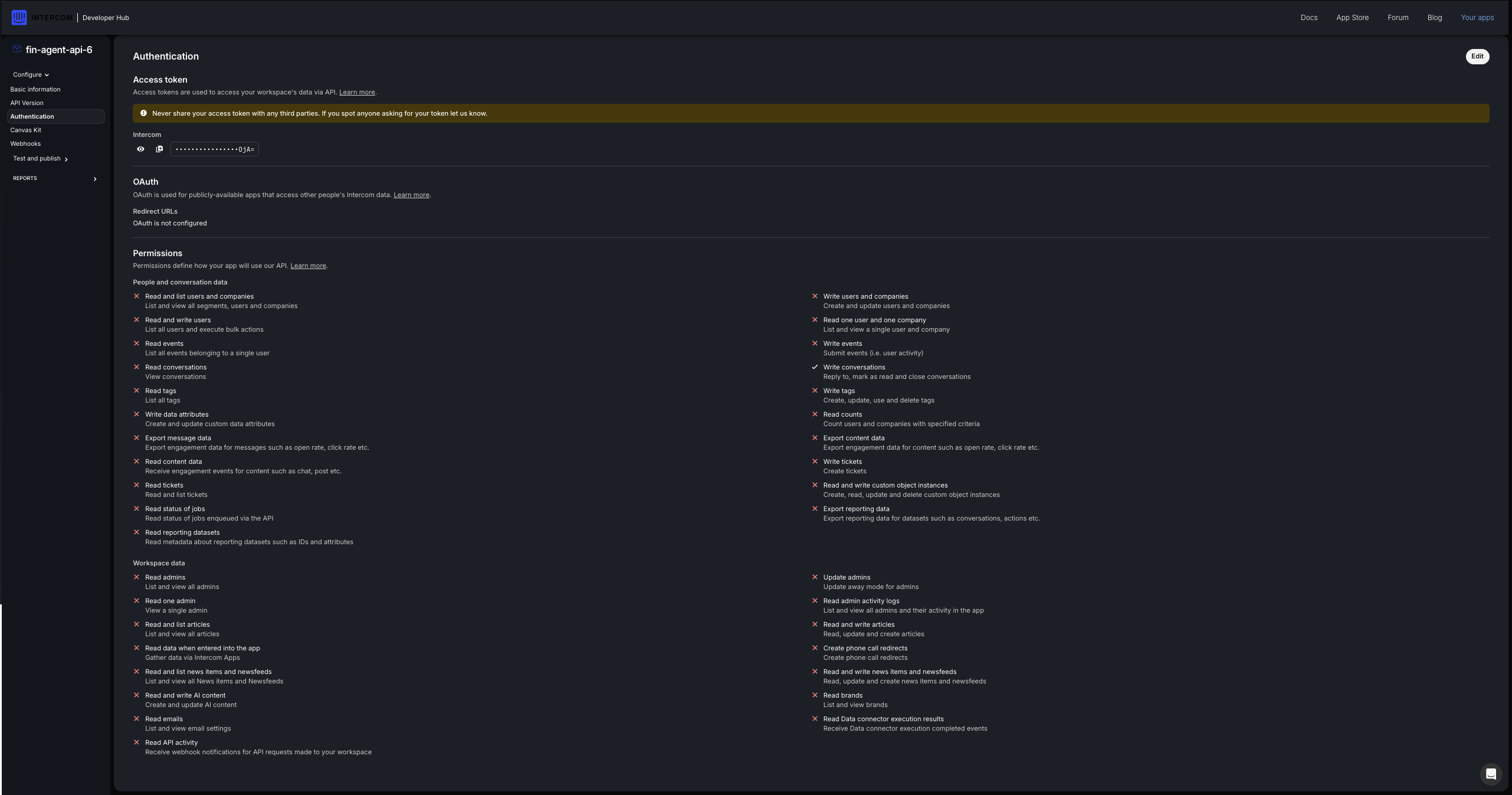 If you need to adjust the OAuth scopes for your Fin Agent API token: